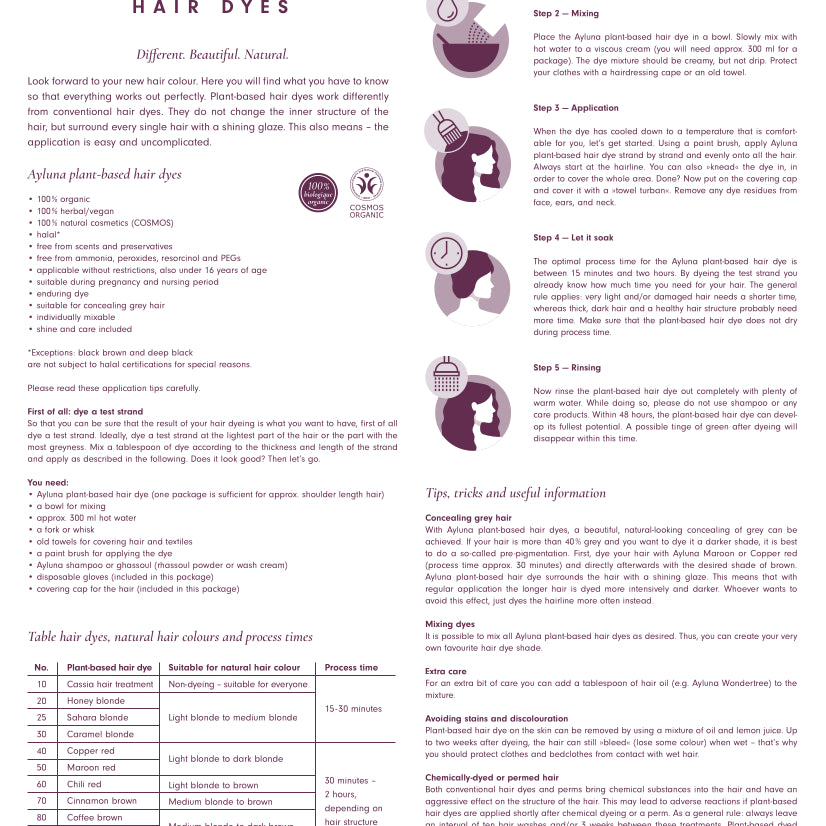 Ayluna plant-based hair dye surrounds every single hair by a shining glaze of selected organic plant extracts. In combination with the natural hair colour expressive, lively shades, shine and volume are created. Gently and enduringly. Unlike chemical hair dyes Ayluna plant-based hair dye has no impact on the natural hair structure. Free from ammonia, peroxides, resorcinol, PEGs, scents and preservatives. Not brightening. 100 % herbal.